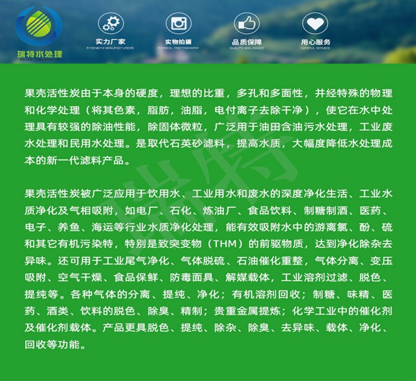 以上果殼活性炭產(chǎn)品信息由鞏義市瑞特水處理材料技術(shù)部編輯提供,轉(zhuǎn)載請(qǐng)說(shuō)明文章出自鞏義瑞特水處理。
