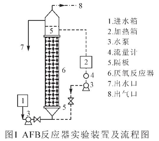 實(shí)驗(yàn)裝置。實(shí)驗(yàn)采用的厭氧流化床反應(yīng)器示意圖見圖1。試驗(yàn)裝置包括進(jìn)水箱,進(jìn)水泵,厭氧流化床反應(yīng)器,加熱箱,回流泵等。厭氧流化床反應(yīng)器主體結(jié)構(gòu)為透明有機(jī)玻璃管制成,便于觀察反應(yīng)區(qū)內(nèi)載體流化情況和產(chǎn)氣等反應(yīng)情況。反應(yīng)器總體高度1600mm,反應(yīng)區(qū)高度1180mm,反應(yīng)器直徑90mm,有效容積7.5L。為了生化反應(yīng)的高效進(jìn)行,采用對回流水加熱,試驗(yàn)采用一臺TDW-2002型自動溫度控制儀控制加熱箱內(nèi)的廢水。