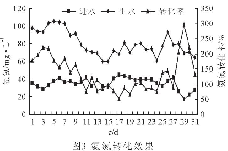由圖3可知,進(jìn)水氨氮為17.36~45.02mg/L,平均為35.33mg/L,出水氨氮為60.14~105.77mg/L,平均為80.21mg/L,系統(tǒng)的氨氮平均轉(zhuǎn)化率為134.85%。