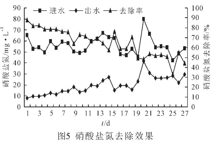 由圖5可知,進(jìn)水硝酸鹽氮為42.21~79.98mg/L,平均為55.83mg/L,出水中硝酸鹽氮為7.99~29.77mg/L,平均為 19.69mg/L,系統(tǒng)的硝酸鹽氮的平均去除率為64.46mg/L。