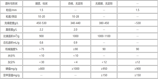 國(guó)內(nèi)用于水處理活性炭的性能及規(guī)格見表